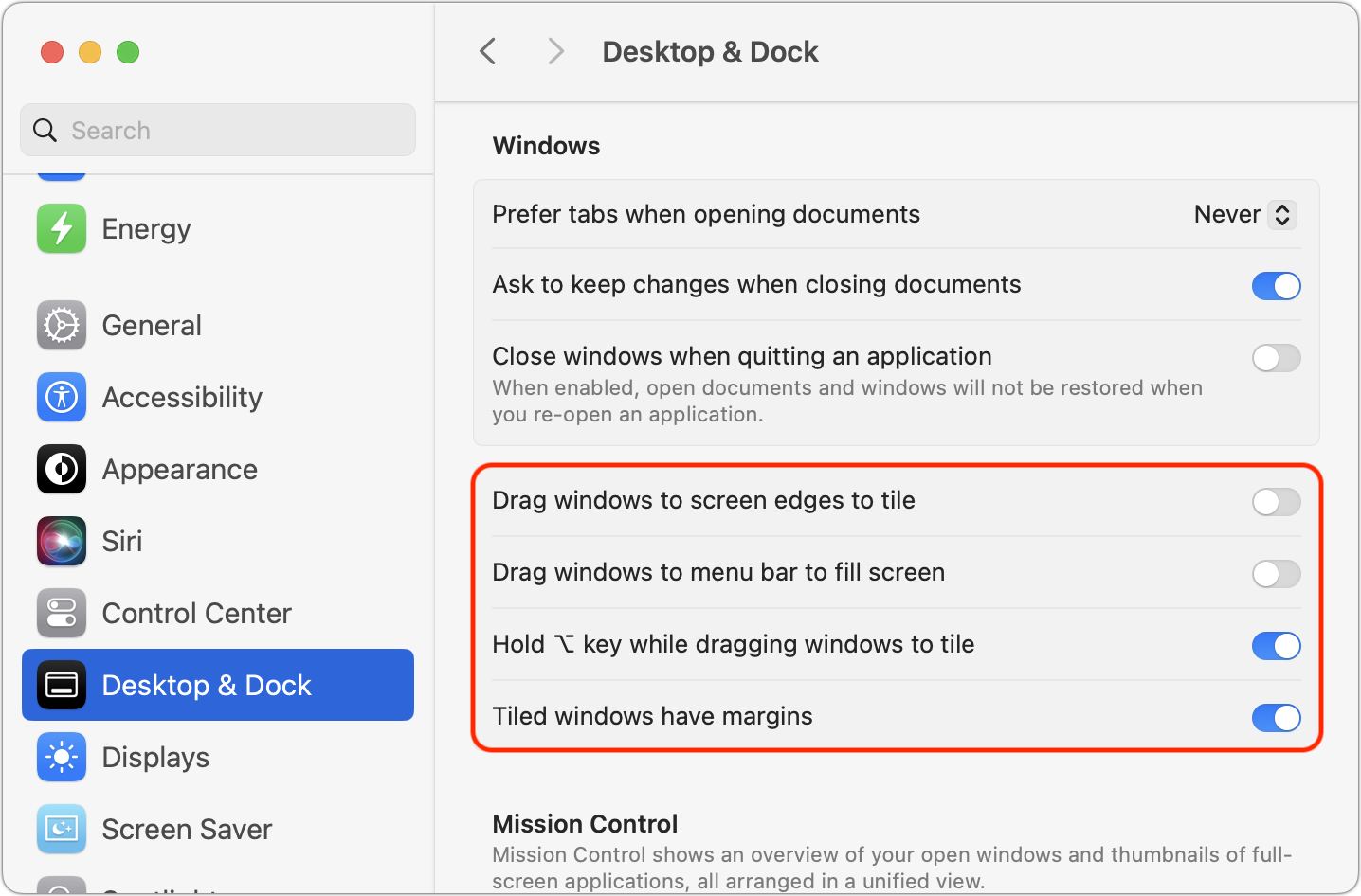One of my favorite features in macOS 15 Sequoia is a new form of window tiling. Drag a window to the menu bar to expand it to fill the screen, to the left or right edge to resize it to half the screen, or to a corner to resize it to that quarter of the screen. As you drag, a white outline shows what will happen when you drop the window. Unfortunately, accidentally invoking window tiling can be surprising and disruptive. The easiest way to ensure that dragging windows tiles them only when you want is to open System Settings > Desktop & Dock, scroll down to the Windows section, and turn off “Drag windows to screen edges to tile” and “Drag windows to menu bar to fill screen.” The important setting to leave turned on is “Hold Option key while dragging windows to tile” because from now on, your windows will tile only when you Option-drag them.